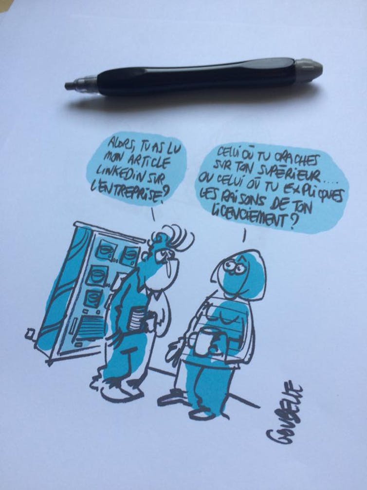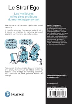 P.-S. Un merci tout particulier à Didier Pourquery, directeur de la rédaction de The Conversation France, à Leighton Kille, directeur de la rédaction adjoint, coordination internationale et technique, ainsi qu’à leurs équipes pour leurs temps et leurs enseignements. Merci à Anne Laure Oudinot, directrice de la communication de Grenoble École de Management et Michel Magali, administratice de la recherche pour leur soutien. Un grand merci à Laurent Mandica, directeur du département marketing de Grenoble École de Management pour son extraordinaire capacité à me supporter, à Laurence Dussert, chargée de communication com-corporate, et Laura Leick, chargée des relations presse de l’école, ainsi qu’Élodie Auprètre, attachée de presse spécialisée dans l’enseignement supérieur et l’innovation de l’Agence MCM. Enfin merci à Philbert Adamon, mon éditeur chez Pearson France, à Laure Rouchy-Duclaud, éditrice de réalisation, Peggy Renoult, chargée marketing et communication, Alexia Uzzan, coordinatrice marketing enseignement supérieur, David Gamblin, commercial comptes clés chez Pearson France, pour leur confiance, leur écoute et leur gentillesse. Sans oublier et pour conclure mon camarade illustrateur dans ce crime bienveillant de lèse-Internet : le talentueux dessinateur de presse j’ai nommé « Goubelle ».« Le Strat’Ego : les meilleures et les pires pratiques de marketing personnel ». Yannick Chatelain (auteur), Dominique Goubelle (illustration). Paru le 8 juin 2018 Guide (broché) aux éditions Pearson France.