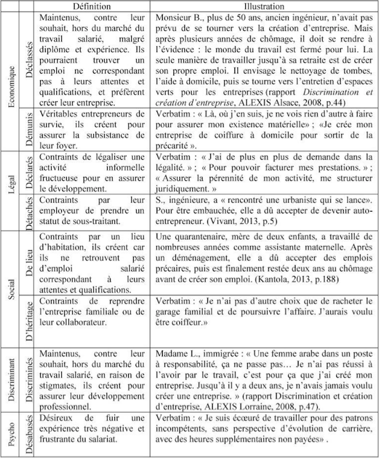Les populations les plus fragiles sont également les plus concernées par ce type de démarche : chômeurs de longue durée, seniors précaires, femmes divorcées avec enfants, immigrés, ruraux, personnes handicapées, au RSA, jeunes sans diplôme. La pauvreté, la mauvaise santé, la marginalisation, la discrimination, poussent certaines populations à cet entrepreneuriat de survie : mues par des « déplacements », comme un échec scolaire, un divorce, un licenciement, une maladie, ces personnes sont forcées de relever un défi pour lequel elles ne sont ni préparées ni motivées, ce qui augmente le risque d’échec.