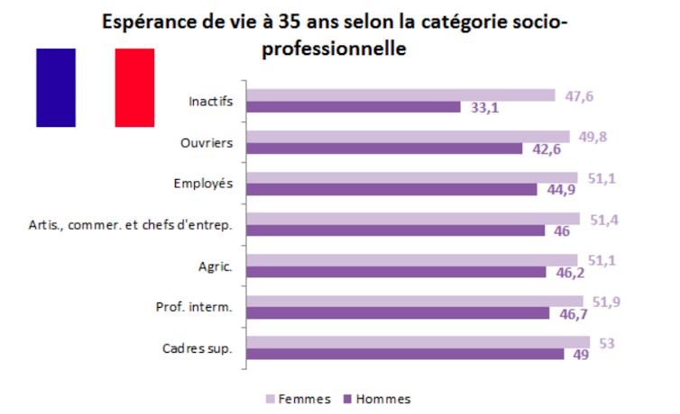 Un autre élément est déterminant pour connaître la pénibilité d’un métier : l’espérance de vie à 35 ans selon la catégorie socio-professionnelle. L’Observatoire des seniors précise qu’il existe un lien direct entre espérance de vie et pénibilité. Mais cette réalité est également à nuancer. Par exemple, un homme-cadre a une espérance de vie à 35 ans de 49 ans contre 49,8 ans pour une femme ouvrière.